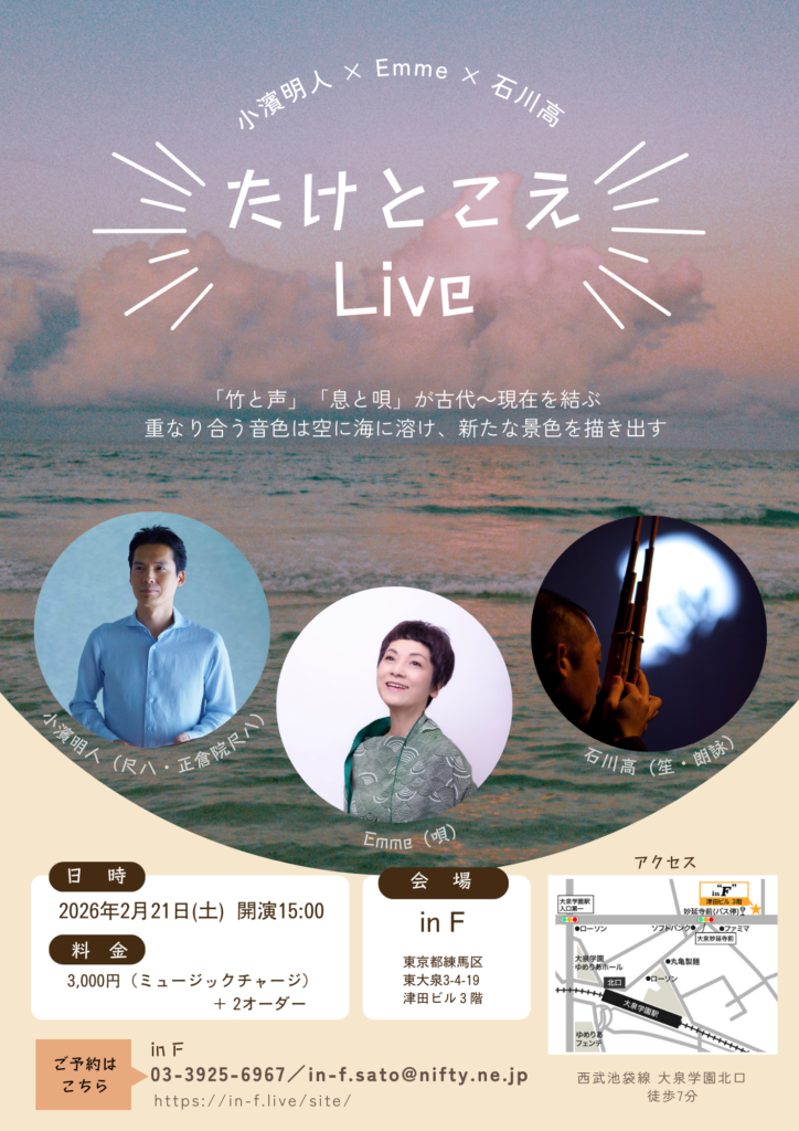 News 1/1邦楽ジャーナル連載「尺八と偉人」《聖武天皇》 2/21小濱明人 × Emme × 石川高 「たけとこえ」Live 3/3The Shakuhachi 5 ~第5回 定期公演~ 「尺八協奏曲 / アンサンブル版」(藤倉大 作曲) Sound Movie 山下洋輔 & LOTUS POSITION 古典本曲「山谷」× 雪舟「四季山水図」 「尺八協奏曲/アンサンブル版」(藤倉大作曲) 小濱明人「水」× 雪舟「秋冬山水図」「破墨山水図」 「ゆれる青」(小濱明人作曲) 「おとけい」(小濱明人作曲)