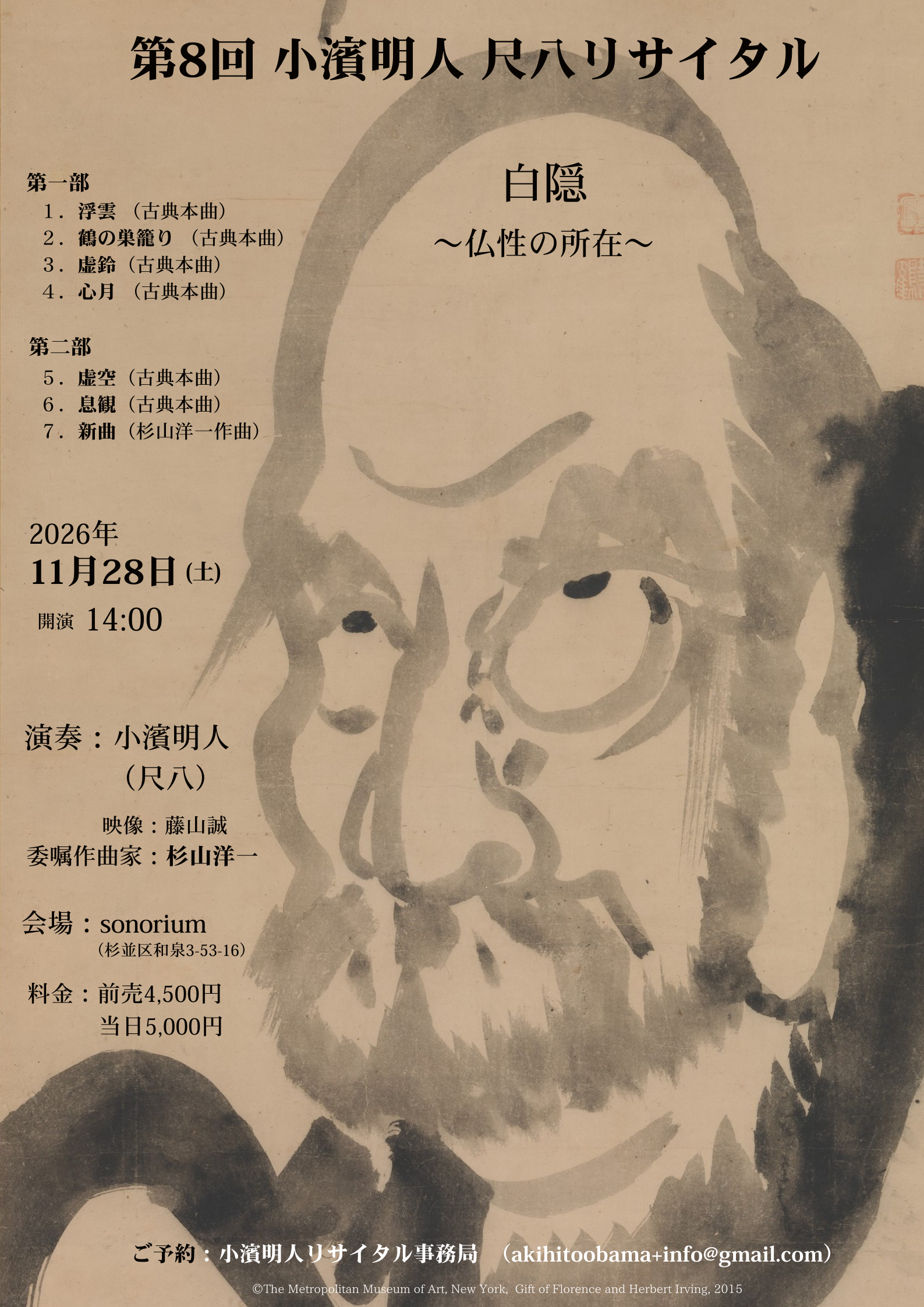 タイトル 第8回 小濱明人 尺八リサイタル 「白隠~仏性の在所~」 開催日 2026年11月28日(土)開場13:30 開演14:00 会 場 東京都 杉並区 sonorium (東京都杉並区和泉3-53-16)永福町徒歩7分 料 金 前売4,500円/当日5,000円 問合先 小濱明人リサイタル事務局=オバマ(akihitoobama+info@gmail.com) 出演者 小濱明人(尺八)/委嘱作曲家=杉山洋一 曲 目 第一部:浮雲(横山勝也伝) 鶴の巣籠(横山勝也伝) 虚鈴(明暗真法流) 心月(横山勝也伝) 第二部:虚空(明暗真法流) 息観(横山勝也伝) 委嘱新作「題未定」(杉山洋一作曲)