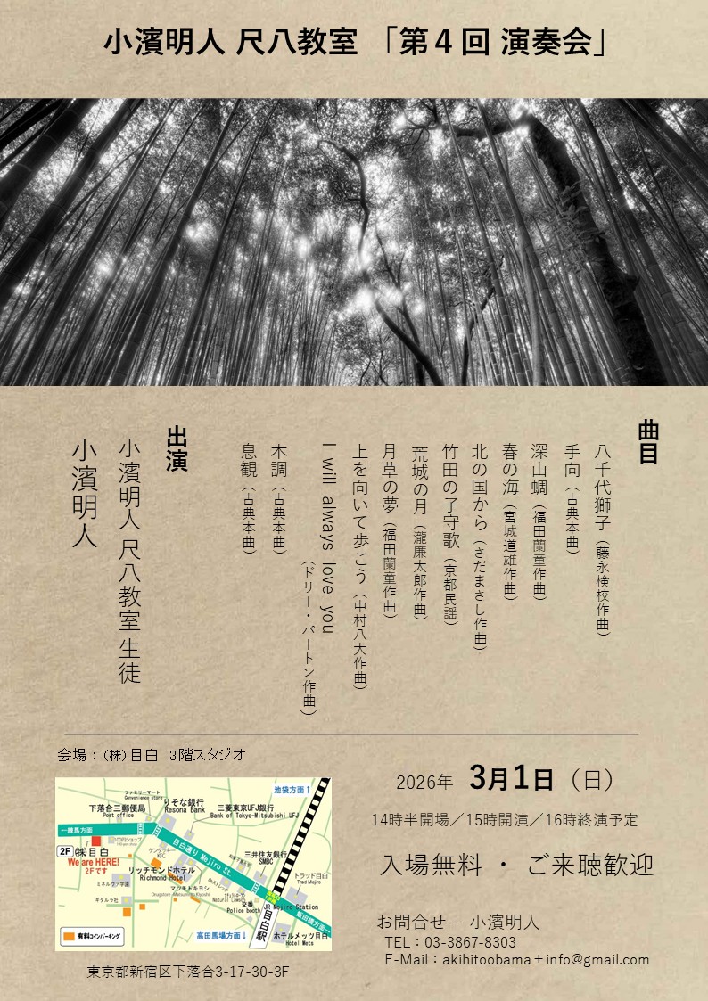 タイトル:小濱明人 尺八教室「第4回 演奏会」 開催日:2026年3月1日(日)開場14:30/開演15:00 場 所:(株)目白 3階 スタジオ M(東京都新宿区下落合3-17-30) 料 金:入場無料・ご来聴歓迎 問合先:オバマ(03-3867-8303/akihitoobama+info@gmail.com)
