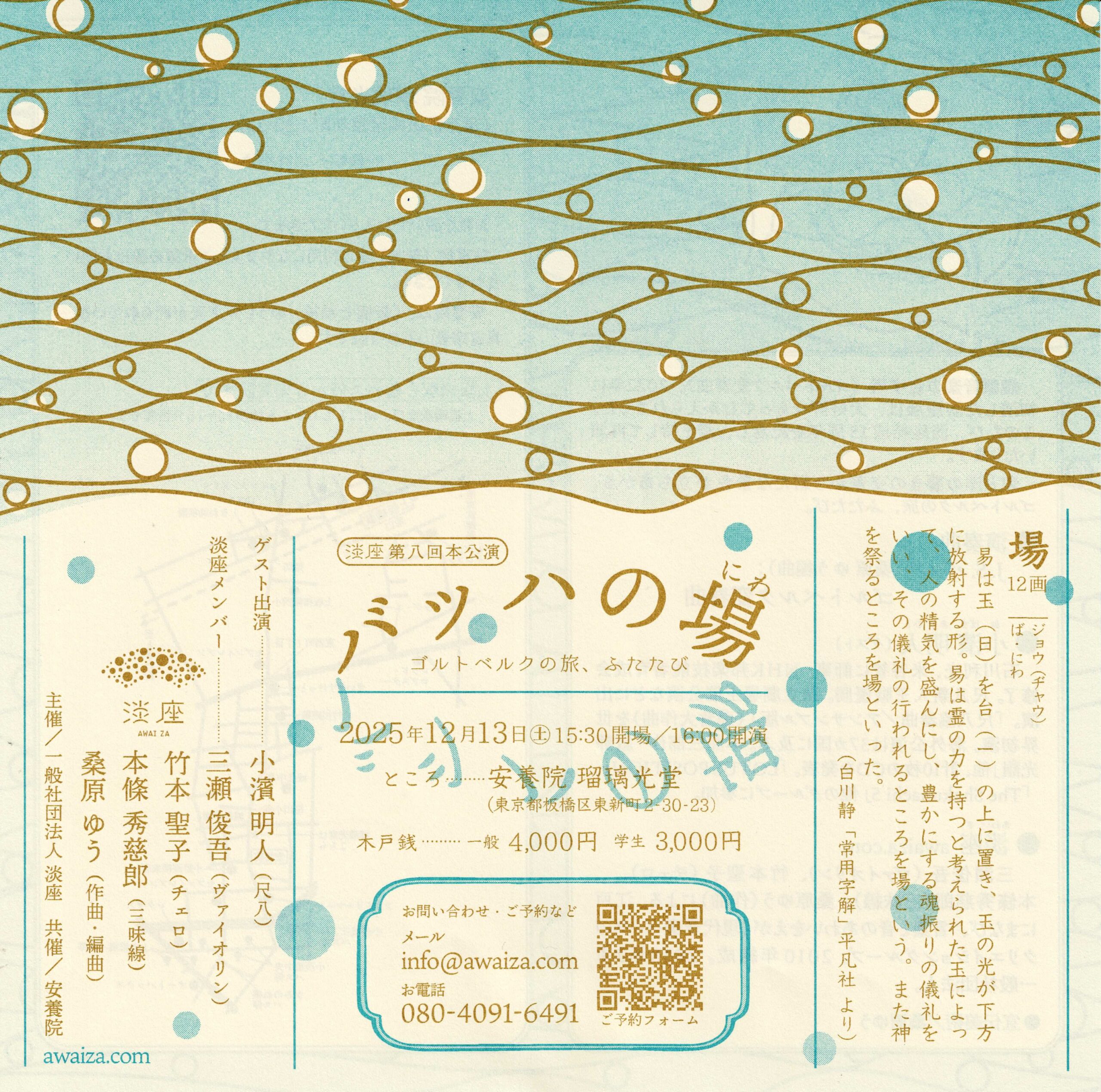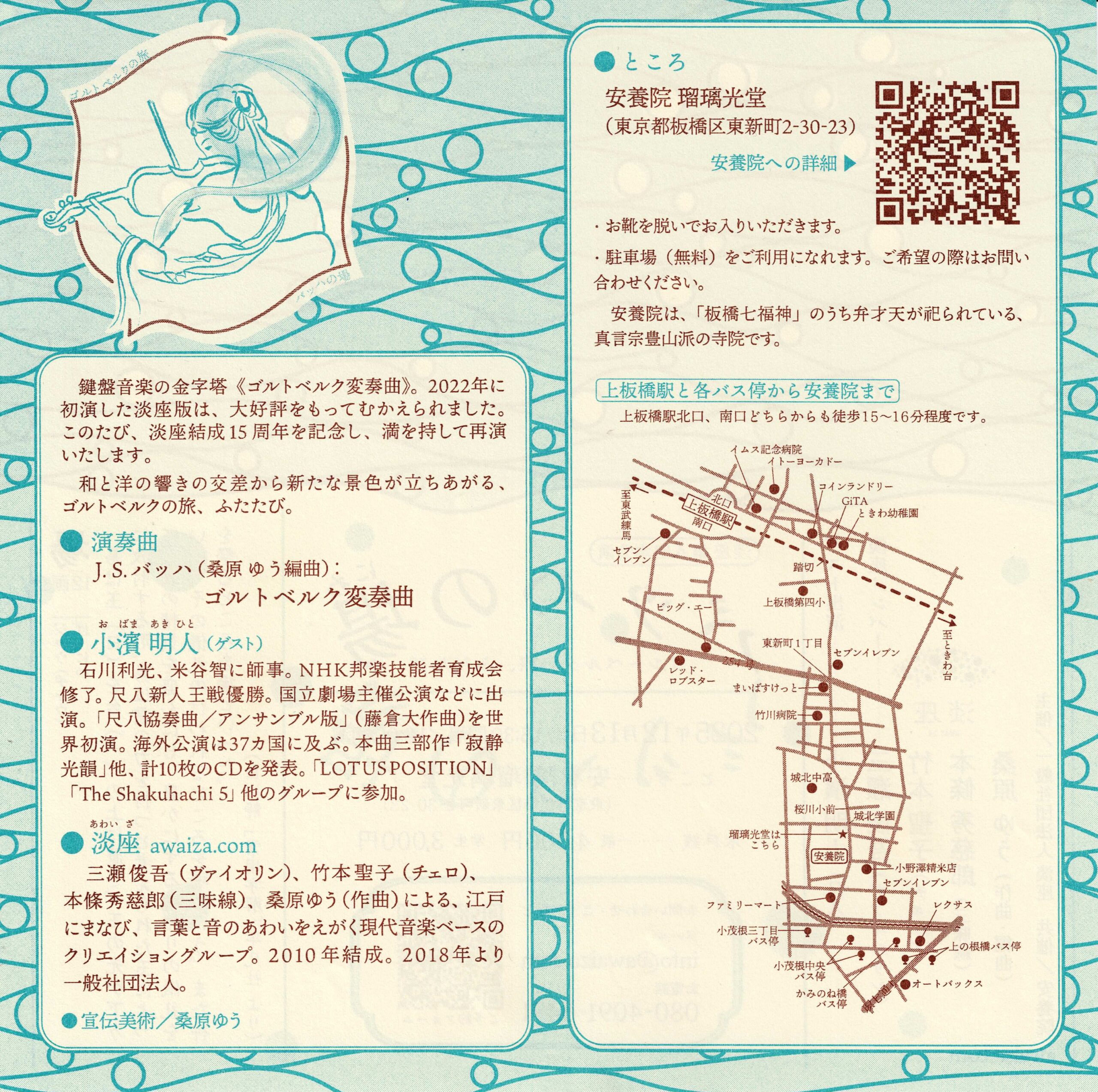 2025年12月13日(土)16:00~ 《淡座》第八回本公演 ~バッハの場(にわ)~ 場所:安養院 瑠璃光堂(東京都板橋区東新町2-30-23) *お靴を脱いでお入りいただきます。 *駐車場(無料)をご利用いただけます。 ご利用をご希望の際はご一報ください。 出演:淡座=三瀬俊吾(ヴァイオリン)・竹本聖子(チェロ)・ 本條秀慈郎(唄・三味線)・桑原ゆう(作曲・編曲) ゲスト=小濱明人(尺八) 曲目:J.S.バッハ(桑原ゆう編曲):ゴルトベルク変奏曲 問合先:淡座(info@awaiza.com/080-4091-6491) コメント:鍵盤音楽の金字塔《ゴルトベルク変奏曲》。2022年に 初演した淡座版は、 大好評をもってむかえられました。このたび、淡座結成15周年を記念し、 満を持して再演 いたします。 和と洋の響きの交差から新たな景色が立ちあがる、 ゴルトベルクの旅、ふたたび。 お申し込みフォーム