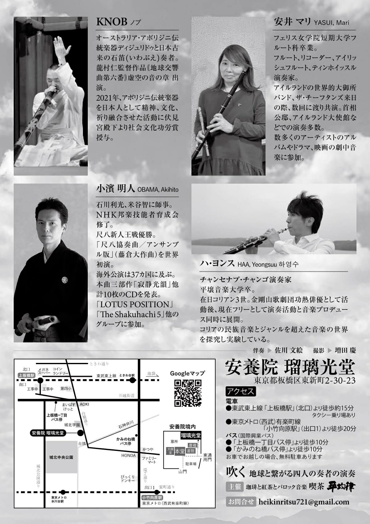 喫茶「平均律」主催コンサート「吹く」 開催日 2026年5月24日(日)14:00 開演(13:30 開場) 場 所 安養院 瑠璃光堂(東京都板橋区東新町2-30-23) 料 金 全自由席5,500円(消費税込) お申込 Peatix 問合先 喫茶「平均律」(heikinritsu721@gmail.com) 出演者 KNOBノブ(ディジリドゥ)/安井マリ(アイリッシュフルート)/ 小濱明人(尺八)/ハ・ヨンス(チャンセナプ) コメント 吹くことは息をすること 生きるそのもの 呼吸は空気と繋がり 地球と繋がる 四人の奏者の演奏 オーストラリア・アボリジニの「ディジリドゥ」、 アイルランド「アイリッシュフルート」、日本「尺八」、 朝鮮半島「チャンセナプ」、による笛の演奏会。