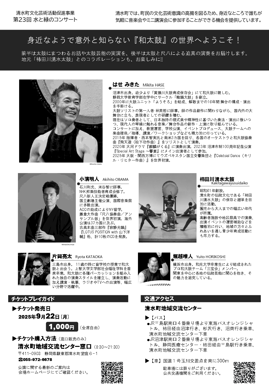 [タイトル] はせみきた 和太鼓コンサート ~第23回 水と緑のコンサート~ [日時] 2025年11月30日(日)13:30開場/14:00開演 [会場] 清水町地域交流センター(駿東郡清水町堂庭6-1) JR三島駅南口よりバスにて約20分/JR沼津駅南口よりバスにて約30分 [料金] 全席自由 ¥1,000 [出演] はせみきた(和太鼓)、小濱明人(尺八)、 片岡亮太/堀越唯人(和太鼓サポート) [主催・お問い合わせ] 清水町教育委員会 社会教育課(TEL 055-972-6678)