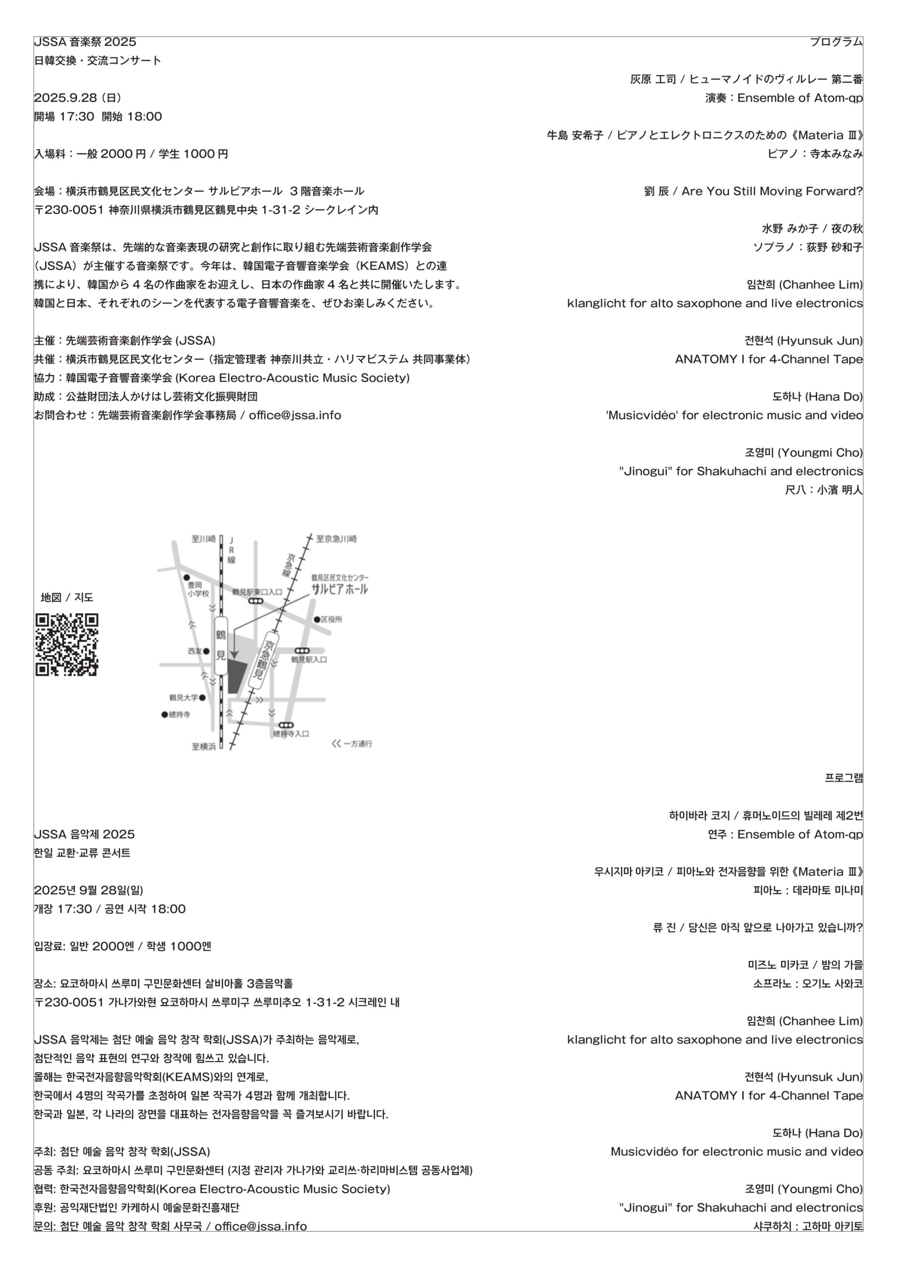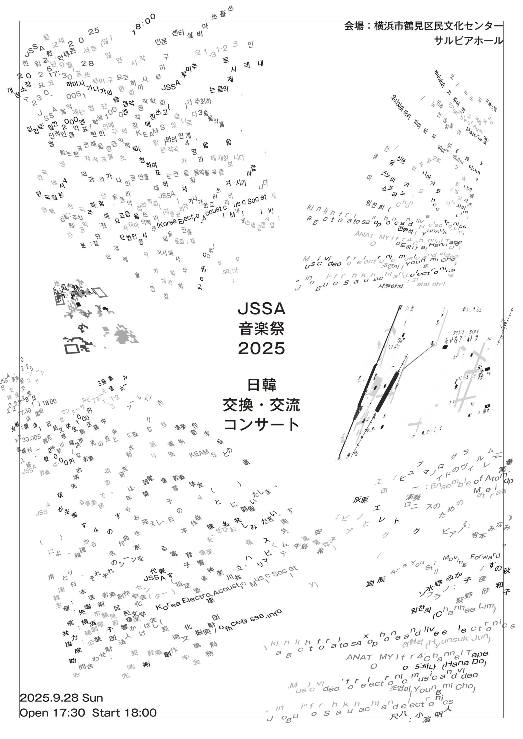JSSA音楽祭は、先端的な音楽表現の研究と創作に取り組む 先端芸術音楽創作学会(JSSA)が主催する音楽祭です。 今年は、韓国電子音響音楽学会(KEAMS)との連携により、 韓国から4名の作曲家をお迎えし、日本の作曲家4名と共に開催いたします。 韓国と日本、それぞれのシーンを代表する電子音響音楽を、ぜひお楽しみください。 開催日 2025年9月28日(日)開場 17:30 開演 18:00 会場 横浜市鶴見区民文化センター 3階音楽ホール 入場料 自由席/当日一般:2000円/学生:1000円 チケット お申し込みはこちらから 出演 ・灰原 工司「ヒューマノイドのヴィルレー 第二番」/ 演奏)Ensemble of Atom-qp ・牛島 安希子「ピアノとエレクトロニクスのための《Materia Ⅲ》」/ ピアノ)寺本みなみ ・劉 辰「Are You Still Moving Forward ?」 ・水野 みか子「夜の秋」/ ソプラノ歌手)荻野砂和子 ・임찬희 (Chanhee Lim)「klanglicht for alto saxophone and live electronics」 ・전현석 (Hyunsuk Jun)「ANATOMY I for 4-Channel Tape」 ・도하나 (Hana Do)「‘Musicvidéo’ for electronic music and video」 ・조영미 (Youngmi Cho)「“Jinogui” for Shakuhachi and electronics」/ 尺八)小濱明人 主催・お問い合わせ 先端芸術音楽創作学会(office@jssa.info)