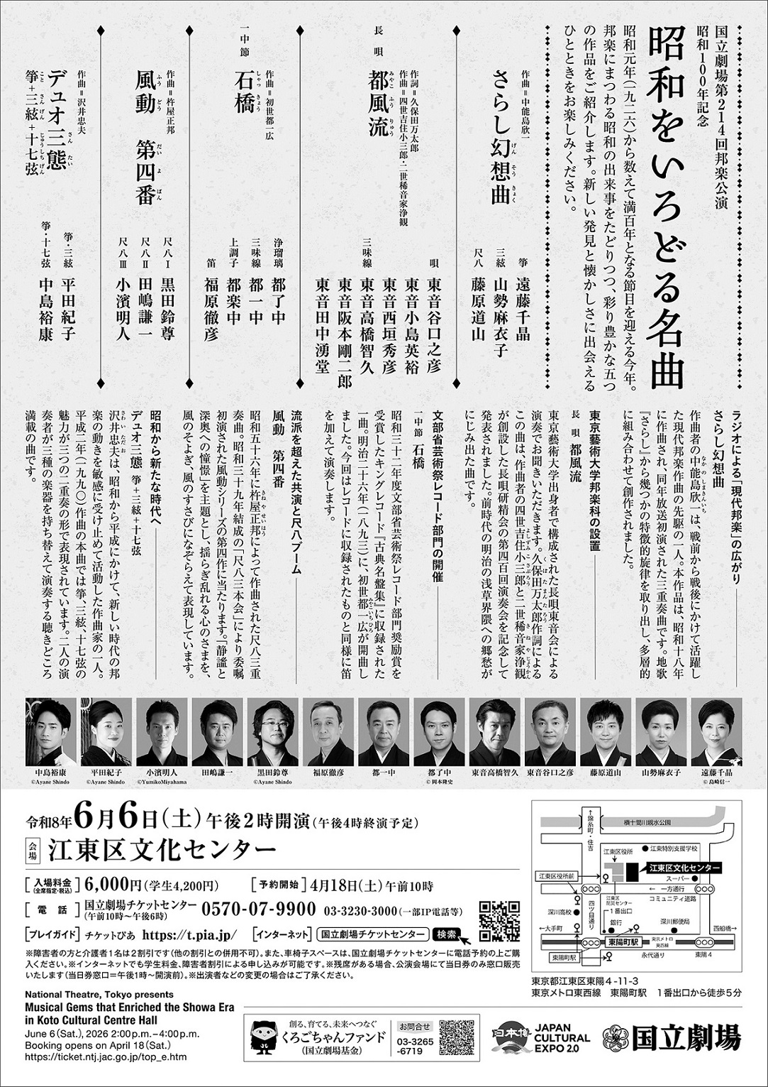 国立劇場 第214回 邦楽公演 「昭和100年記念〈昭和をいろどる名曲〉」 日 時:令和8年6月6日(土) 午後2時開演/午後4時頃終演予定 会 場:江東区文化センター 料 金:6,000円(学生4,200円)※税込・全席指定 問合先:国立劇場チケットセンター(午前10時~午後6時)⇒ 0570(07)9900 演 目: 作曲 中能島欣一 「さらし幻想曲」 箏 遠藤千晶 三絃 山勢麻衣子 尺八 藤原道山 作詞 久保田万太郎 作曲 四世吉住小三郎・二世稀音家浄観 長唄「都風流」 唄 東音谷口之彦 唄 東音小島英裕 唄 東音西垣秀彦 三味線 東味高橋智久 三味線 東音阪本剛二郎 三味線 東音田中湧堂 作曲 初世都一広 一中節「石橋」 浄瑠璃 都了中 三味線 都一中 上調子 都楽中 笛 福原徹彦 作曲 杵屋正邦 「風動 第四番」 尺八Ⅰ 黒田鈴尊 尺八Ⅱ 田嶋謙一 尺八Ⅲ 小濱明人 作曲 沢井忠夫 「デュオ三態 箏+三絃+十七弦」 箏・三絃 平田紀子 箏・十七弦 中島裕康
